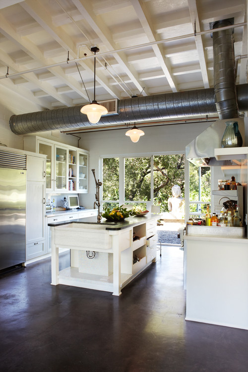 1 of the kitchen's walls has a weathered and worn white wash that plays beautifully with the exposed ceilings and state-of-the-art white isle.